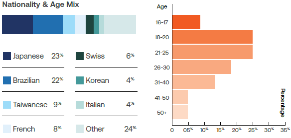 主要國籍:日本、巴西、沙烏地阿拉伯、瑞士、法國、台灣、其他