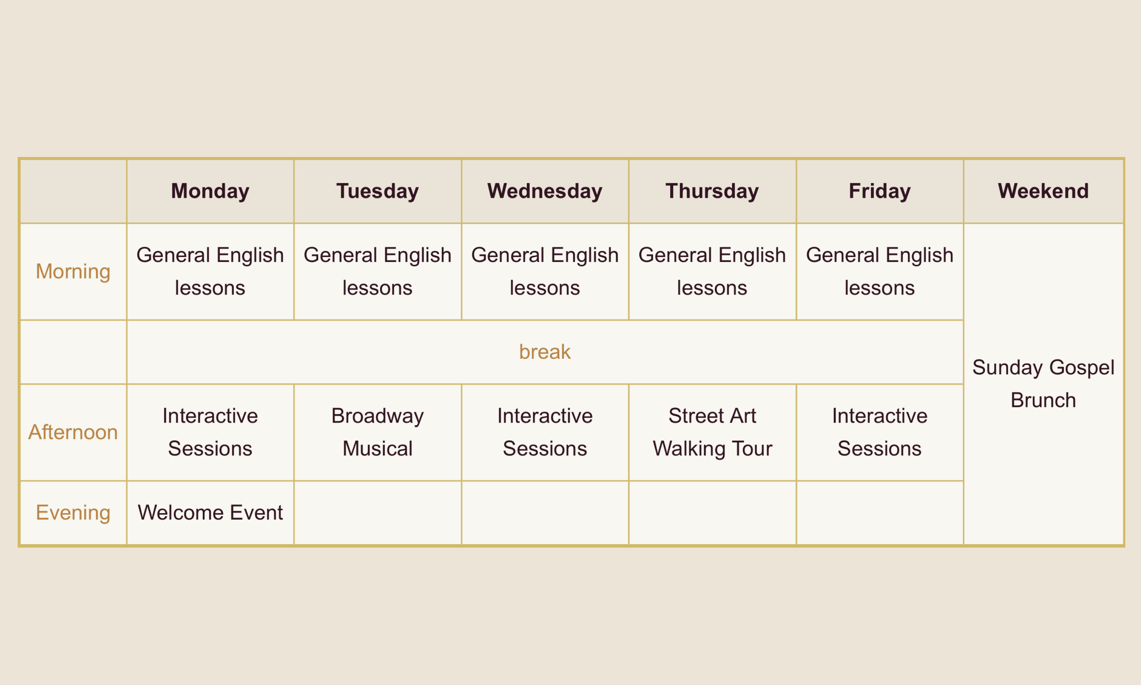 體驗真實地融入式學習,每週有4堂課著重在與您所選目的地息息相關的語言學習。每週部分課堂都會要求全班走出教室,參訪當地的重要地點和進行各種活動。有些課堂也會涵蓋每週變換的不同主題,包括:「商業英語 - 在地企業之旅」、「描述藝術與文化 - 參觀博物館」、「像當地人一樣說話 - 社區參訪」等課程。每週一開課(當週一是公共假期時就改為週二)。