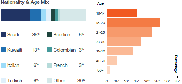 國籍比列:西班牙 (12%)、巴西(10%)、科威特 (9%)、瑞士 (6%)、哥倫比亞(5%)、沙烏地阿拉伯 (30%)、阿曼 (6%)、其他 (22%)