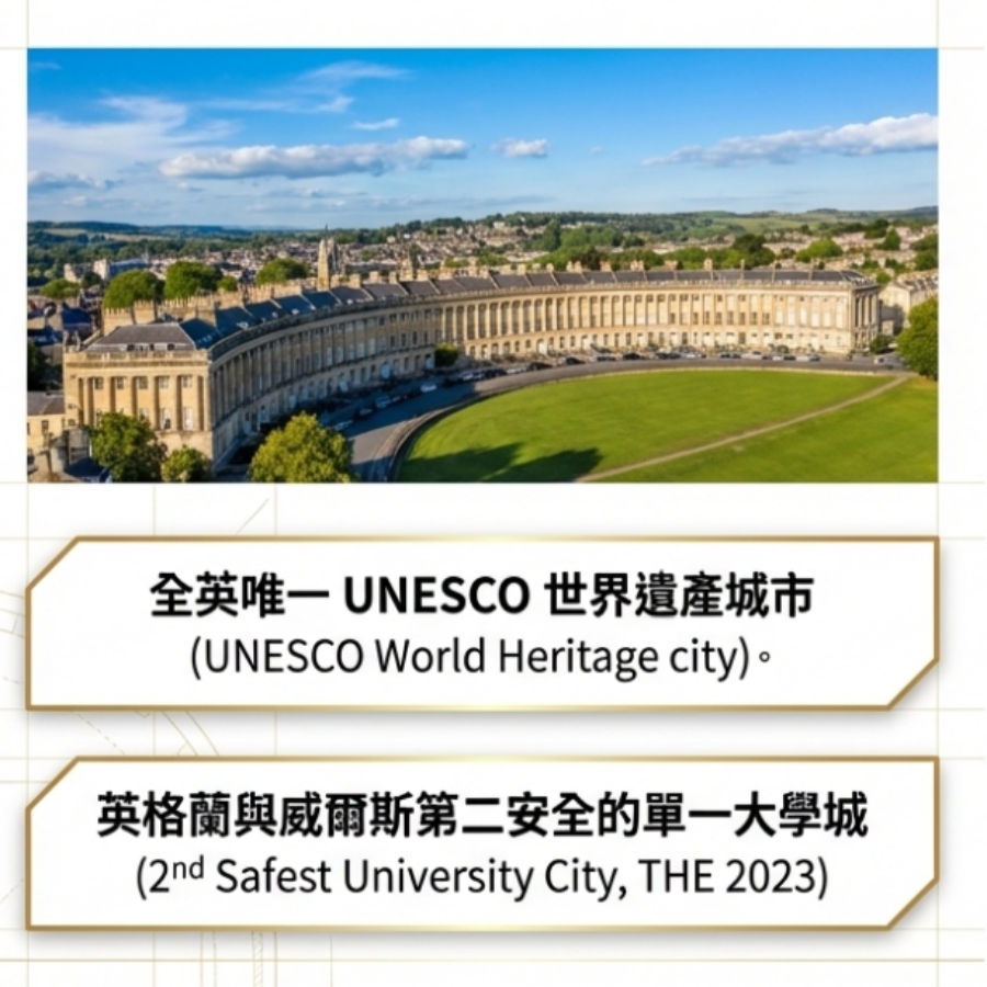 - 城市魅力與安全: 巴斯是英國唯一整座城市被列入 UNESCO 世界遺產的城市。根據 2023 年 THE 調查,巴斯是英格蘭與威爾斯地區第 2 安全的大學城,這對注重安全的台灣家長來說是極大的安心保障。
