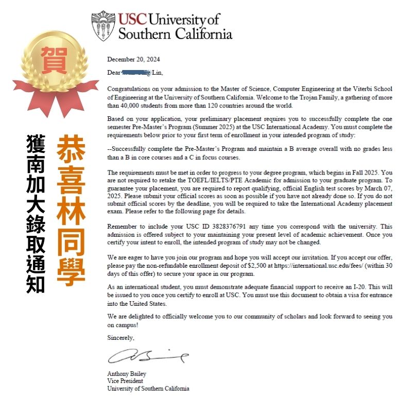 直到大學畢業後,在媽媽的陪同下再次來到美立達,帶著沒有很滿意的托福和GRE成績,請顧問分析優勢、弱項和選校方向。在顧問中肯的分析與策略建議下,林同學覺得清楚和踏實,所以就決定合作了。申請方向是美國前50名電腦工程學院碩士,最終收到了申請各校的錄取,並且收到 USC 的 offer時,那一刻真的超興奮!
