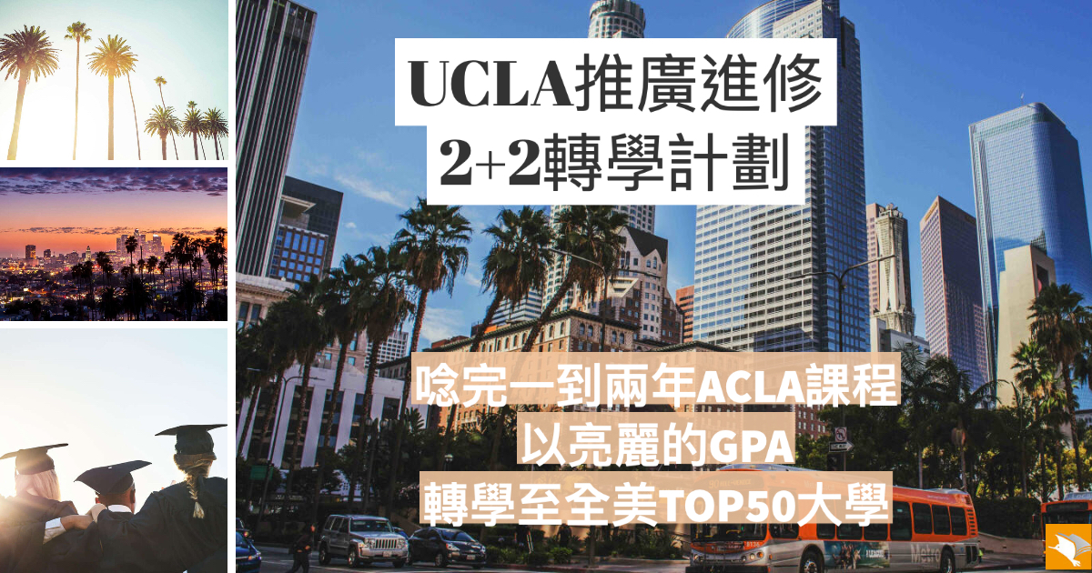 University of California, Los Angeles Extention 加州大學洛杉磯分校(UCLA)進修推廣中心,兩年大一及大二學分修課精英計劃,國際學生服務團隊全力協助學生提升大一及大二在校成績、英文能力等,通過密集大一及大二通識課程學習,2+2課程,個人化定制課程計劃,提升申請者學術背景競爭力,順利轉學至全美前五十前名校。 在ACLA上課修得美國大學大一及大二通識課程學分