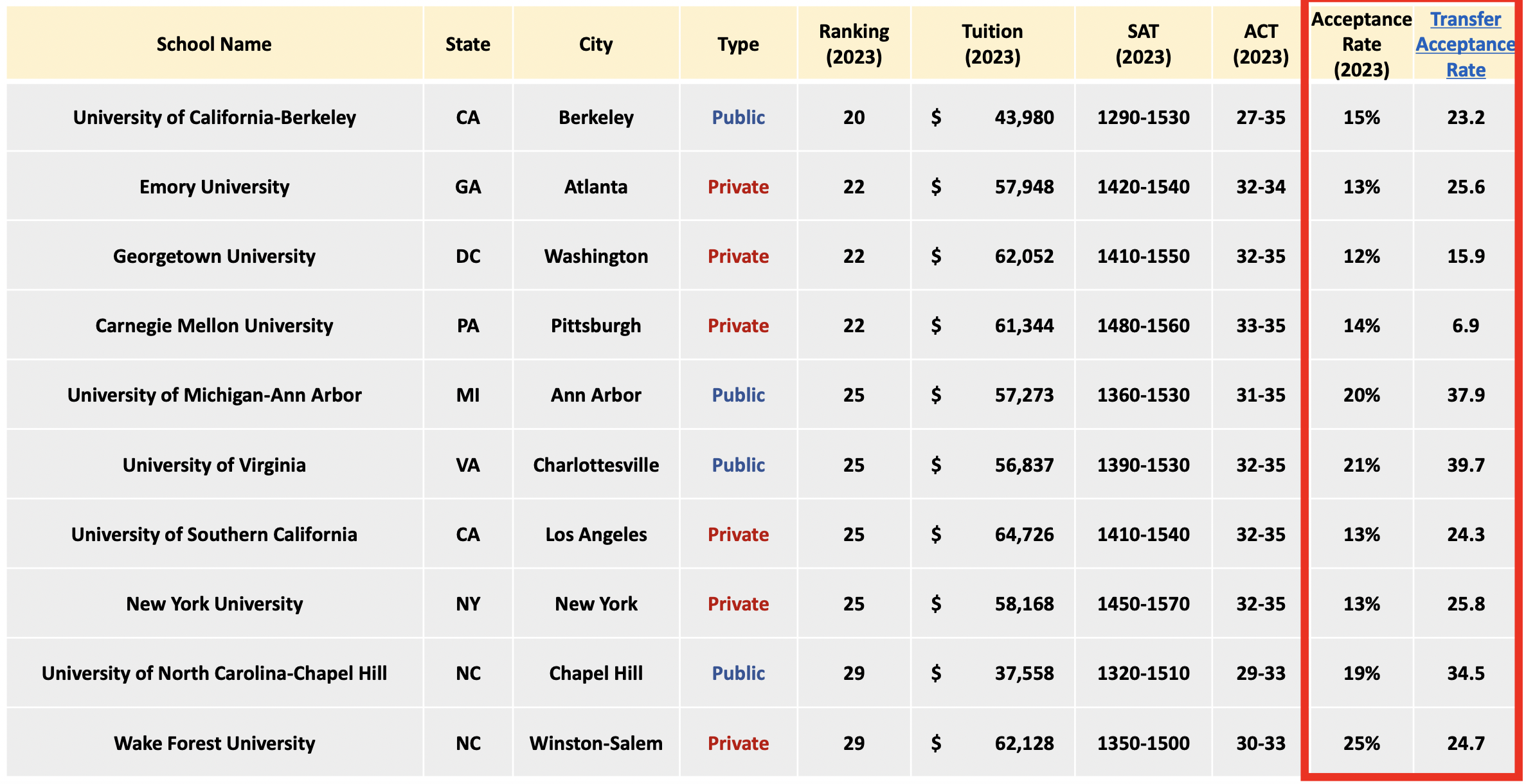 美國大學轉學錄取率Transfer Student Acceptance Rate
