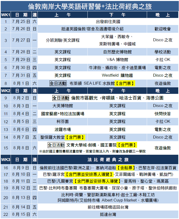 *上述課程內容將視實際天候及國外學校安排等原因做適度調整,實際課表請依照現場所發放課表為準。