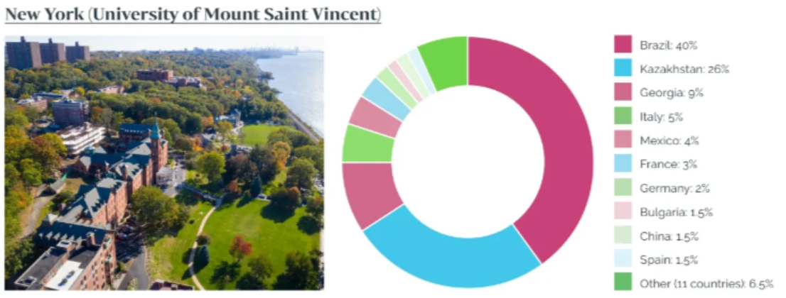 聖文森山學院(College of Mount Saint Vincent) 位於紐約市美麗的Riverdale,俯瞰哈德遜河和曼哈頓島。校園在這風景如畫、安全寧靜的住宅區,學生將住在學校宿舍,深入體驗美國大學生活方式。從宿舍步行即可抵達教室,省去通勤時間,讓學生有更多學習英語、與來自各國的同學互動、參與更多課後活動的機會。每週 15 小時英語課程外,也會有每週一至三次校外旅遊,探索紐約的曼哈頓:布魯克林大橋及紐約世貿中心遺址與世貿一號樓、大都會博物館、哈德遜城市廣場、中央車站與第五大道、自然歷史博物館 …… 等。