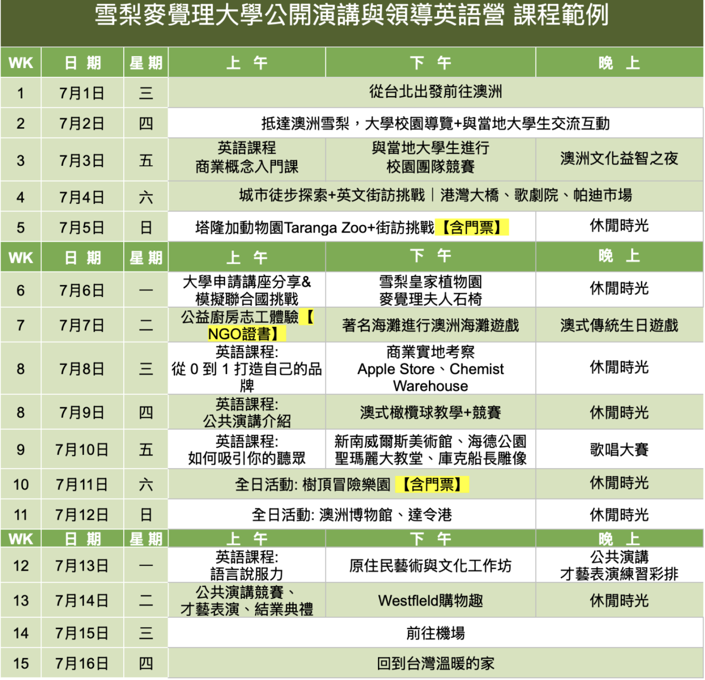 ※上述課程內容將視實際天候及國外學校安排等原因做適度調整,實際課表請依照現場所發放課表為準。