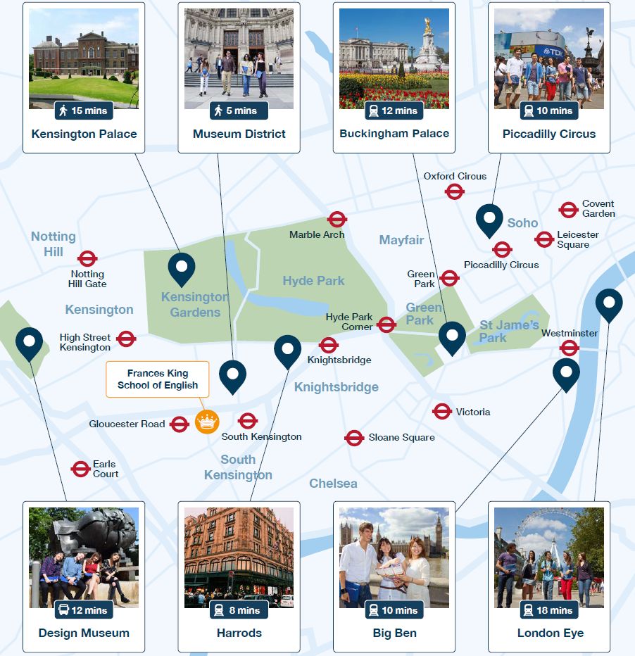 倫敦分校坐落於舉世聞名的 肯辛頓/切爾西 (Kensington & Chelsea) 精華地段。此區環境優雅富文化,從校區步行即可輕鬆抵達倫敦最著名的海德公園 (Hyde Park),周邊環繞世界級的文化地標:自然史博物館 (Natural History Museum)、維多利亞與艾伯特博物館 (V&A) 和 科學博物館 (Science Museum)。遍佈精品咖啡館、時尚購物區及地鐵站( Gloucester Road),確保在學習之餘,能隨時踏出校門,深度體驗最精緻、最道地的倫敦生活。