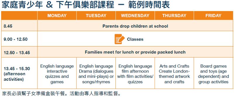 - 12-16歲青少年的全日課,下午提供豐富的午後活動,包括觀光、運動和專題,讓他們將學習和探索倫敦結合。