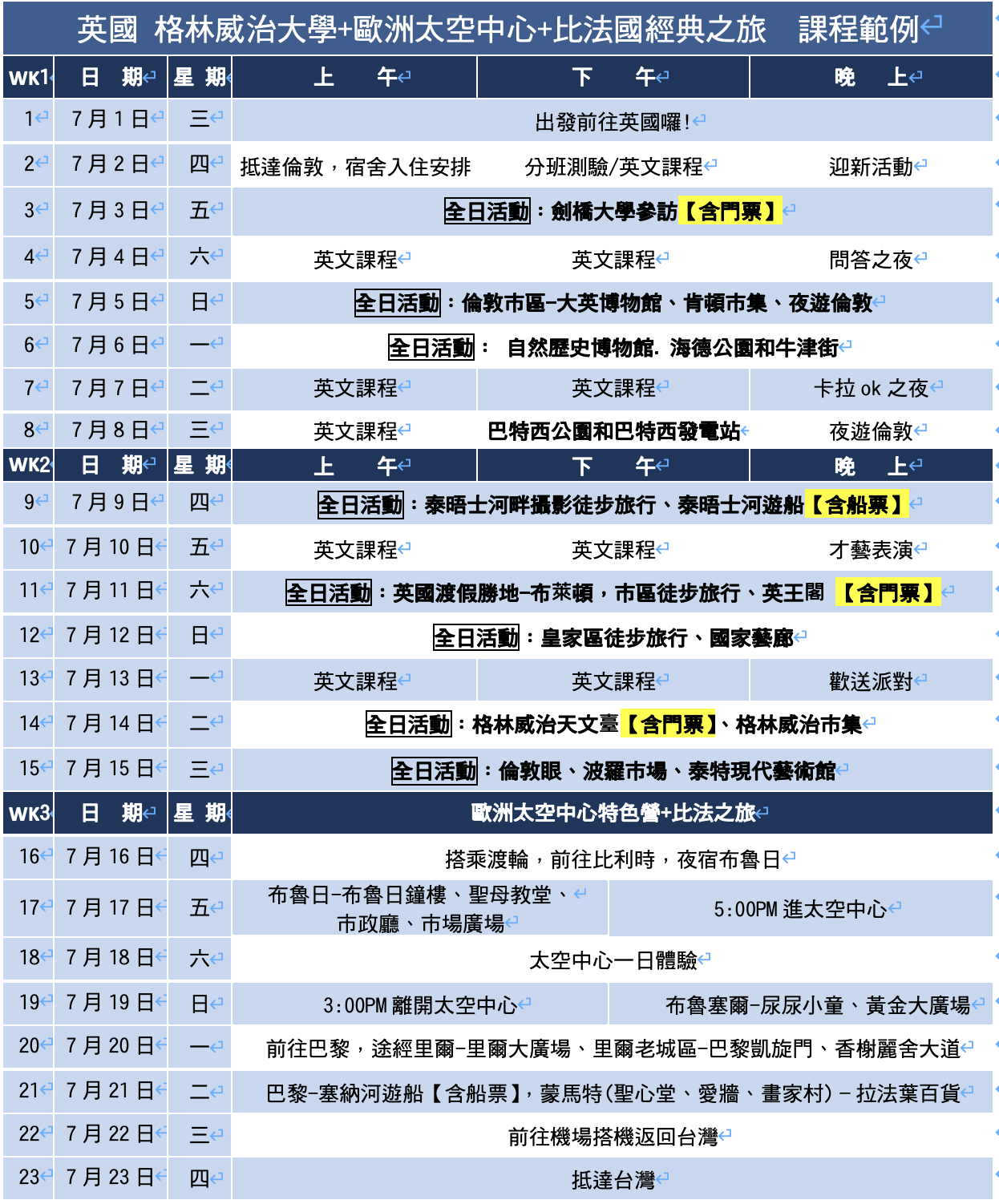 | 日期 | 2026年7月1日-7月23日(共23天)【實際出發日以機位確認後為準】 | ||