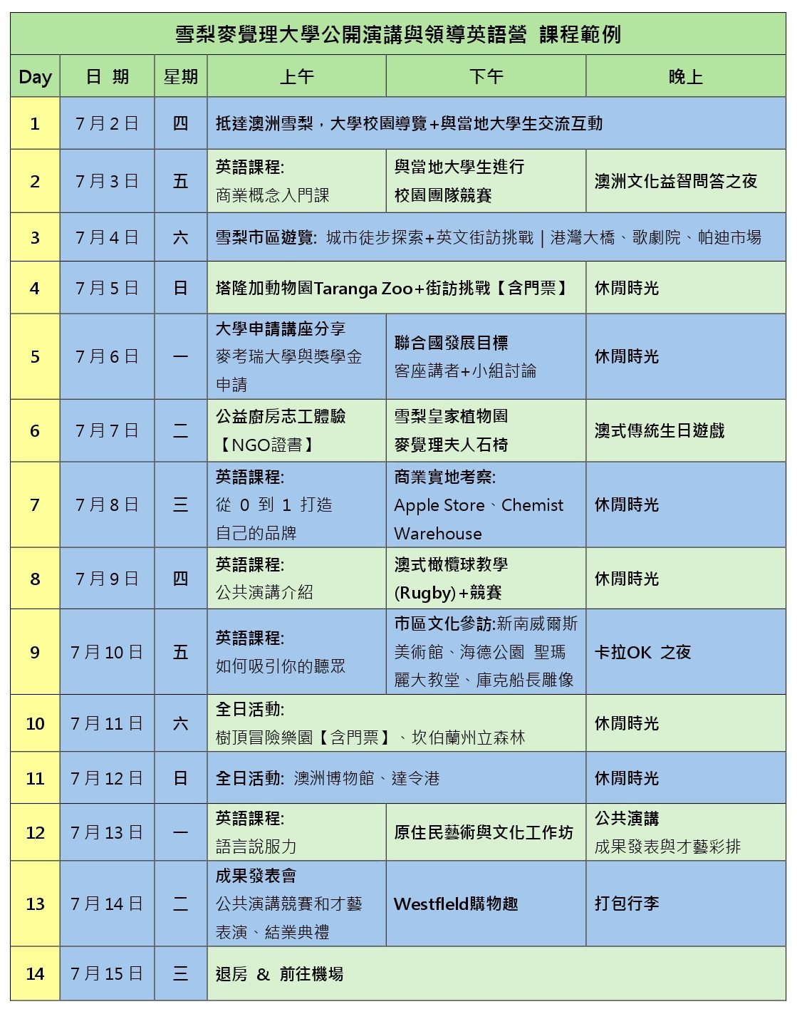 * 食宿與行程: 包含住宿、每日三餐、行程表中所列之私人巴士交通接送、所有英語課程、工作坊、學習教材、結業證書。